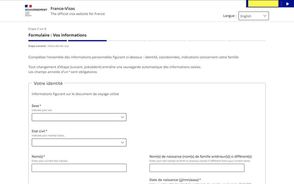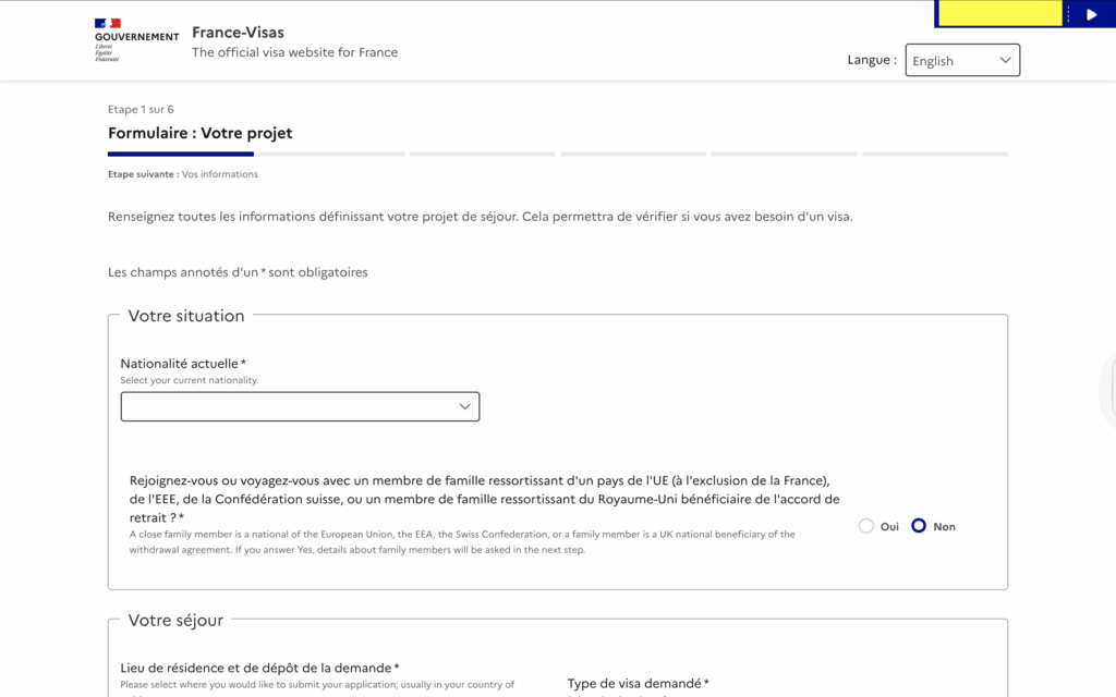 Langue dans laquelle vous souhaitez renseigner votre demande de visa(ビザ申請を進める言語)英語でビザ申請を進めたい場合は「English」を選択(フランス語は「Français」)